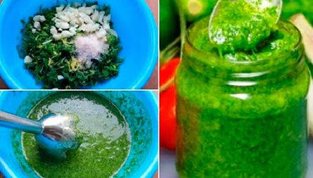 Ингредиенты Укроп — 2 стак. Чеснок — 10 зуб. Лимон — 1 шт. Оливковое масло — 100 мл Соль — 1 ч. л. Сахар — 0,5 ч. л.