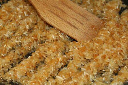 На сковороде разогрейте растительное масло и всыпьте рис.