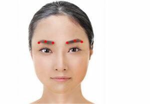 Действие: на внутреннем и внешнем концах и в центре бровей. Поместите указательный и средний пальцы на точки, нажмите. Чтобы брови «вернулись на свое место», направьте нажимное движение на кончики бровей немного вверх. Время: 7 секунд