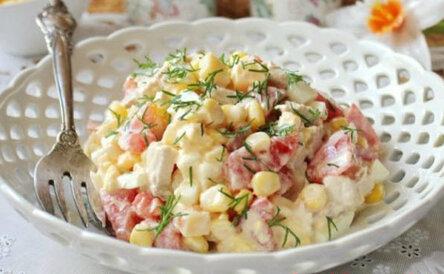 Переложите курицу, сыр, яйца в миску. Туда же добавьте помидоры и кукурузу.Добавьте майонез (немного!), поперчите и перемешайте.