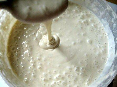 5. Муку просеять, постепенно вмешать в основную массу. В конце добавить раст. масло. Перемешать до однородной массы. Тесто получиться, как жидкая сметана.